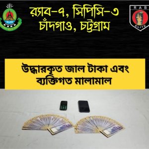 শারদীয় দূর্গাপূজা উপলক্ষে র্যাব-৭, চট্টগ্রাম অভিযোগ পাওয়ার ভিত্তিতে একটি প্রতারক চক্র বাংলাদেশী জাল টাকা তৈরী করে চট্টগ্রাম মহানগরীসহ দেশের বিভিন্ন বাজারে আসল টাকা বলে ছড়িয়ে দিয়ে প্রতারনা করে আসছে। উক্ত অভিযোগের ভিত্তিতে র্যাব-৭, চট্টগ্রাম জাল টাকা তৈরীর সাথে জড়িত প্রতারক চক্রকে আইনের আওতায় নিয়ে আসার জন্য ব্যাপক গোয়েন্দা নজরদারি এবং ছায়াতদন্ত শদারির একপর্যায়ে র্যাব-৭