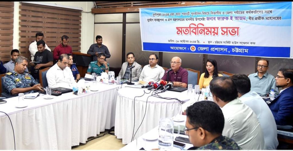 আজ দুর্গাপূজা এবং বন্যা পরবর্তী পুনর্বাসন বিষয়ে নগরীর সার্কিট হাউজের সম্মেলন কক্ষে বিভাগীয় ও জেলা পর্যায়ের কর্মকর্তাদের সাথে মতবিনিময় সভায় দুর্যোগ ব্যবস্থাপনা ও ত্রাণ মন্ত্রণালয়ের উপদেষ্টা ফারুক ই আজম, বীর প্রতীক এসব কথা বলেন।