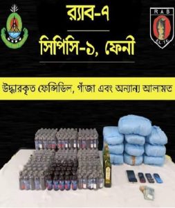 চট্টগ্রাম র্যাব-৭ এর অভিযানে ফেনী থেকে ফেনসিডিল, গাজা ও বিদেশী মদসহ ৪ জনকে আটক করেছে।