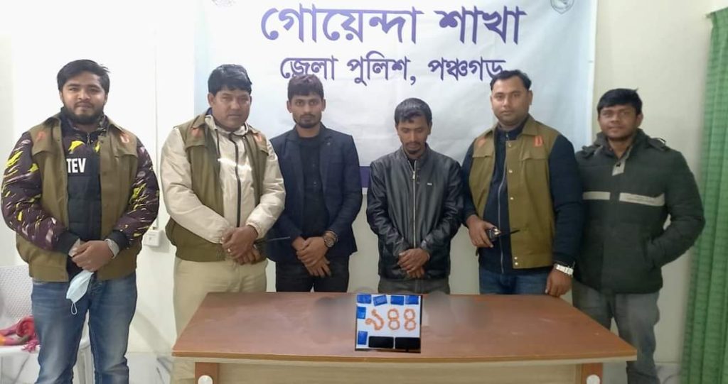 পিতাঃ মোঃ হাফিজ আলী, সাং- ফুটকিবাড়ী (ভোলা বসুনিয়া) ও মোঃ শাহাদুজ্জামান রাসেল (২৫),পিতা মোঃ হাসমত আলী, সাং- বারপাটিয়া (জুরনপাড়া),উভয়থানা-বোদা,জেলা – পঞ্চগড়দ্বয়কে ৪৯০(চারশত নব্বই) পিচ মাদকদ্রব্য ইয়াবা ট্যাবলেটসহ গ্রেপ্তার করা হয়। এ বিষয়ে আজ ৯ জানুয়ারী বোদা থানায় মাদকদ্রব্য আইনে একটি মামলা রুজু করা হয়। গ্রেফতারকৃত আসামিদের প্রাথমিক জিজ্ঞাসাবাদে স্বীকার করে যে, ঘটনার স্থলে আরও ইয়াবা লুকিয়ে রাখা ৪৫৪ পিস ইয়াবা উদ্ধারসহ সর্বমোট ৯৪৪ পিস ইয়াবা উদ্ধার করা হয়।