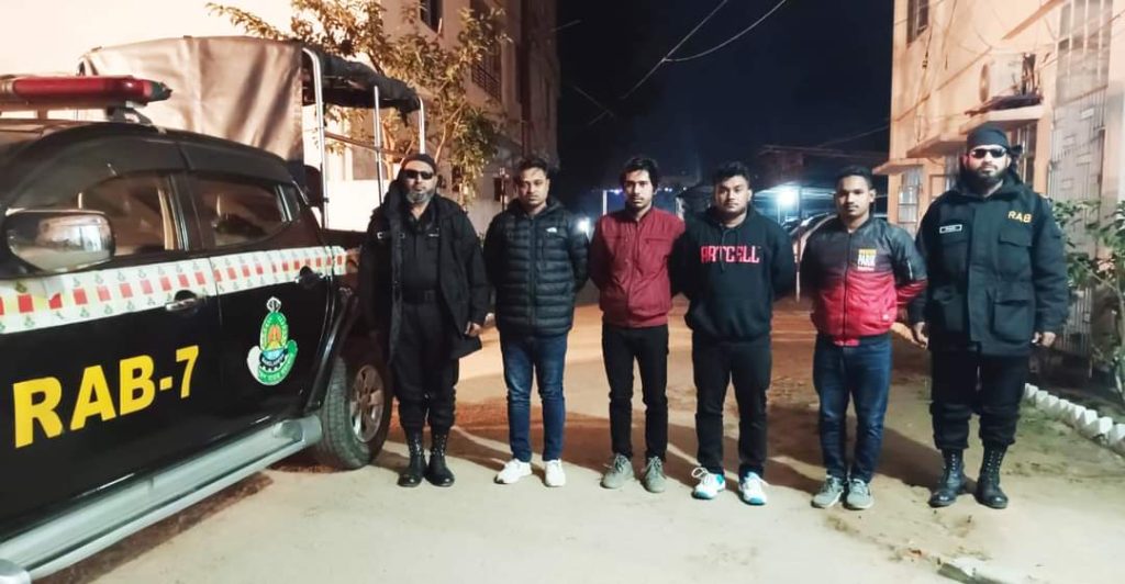 র্যাব-৭ ও র্যাব-১১ এর যৌথ অভিযানে চট্টগ্রামের জোরারগঞ্জ বিজয় মেলা নিয়ে এলাকায়ত সংঘটিত সশস্ত্র গোলাগুলি মামলার অন্যতম প্রধান চার আসামীকে গ্রেফতার করেছে।