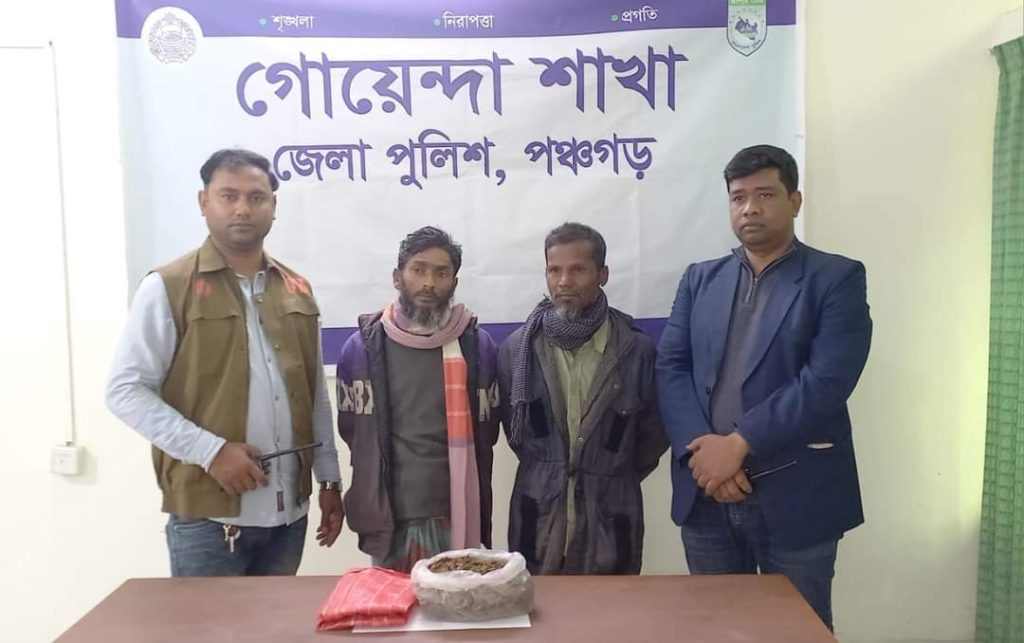 পঞ্চগড় জেলার পুলিশ সুপারের দিক নির্দেশনায় ও অফিসার ইনচার্জ জেলা গোয়েন্দা শাখা (ডিবি) গত ৬ ফেব্রুয়ারী জেলা গোয়েন্দা শাখা পঞ্চগড়ের এসআই, লিপন কুমার বসাক এর নেতৃত্বে এস আই আসাদুজ্জামান, এএসআই, নয়ন দেবনাথ ও সঙ্গীয় ফোর্সসহ দেবীগঞ্জ থানা এলাকায় মাদকদ্রব্য উদ্ধার অভিযান চালিয়ে দেবীগঞ্জ থানাধীন ৫ নং সুন্দরদীঘী ইউনিয়ন এর মোটাপাড়া কালীর ডাঙ্গা গ্রামস্থ শাহজাহান (মন্ডল) (৫০), পিতাঃ মৃত হোসেন আলী, সাং- মোটাপাড়া কালীরডাঙ্গা, থানা- দেবীগঞ্জ, জেলাঃ পঞ্চগড় এবং মোঃ হযরত আলী(৪৭) পিতা- মোঃ হবিবর রহমান, সাং- হাজরাডাঙ্গা, ৫ নং সুন্দরদীঘী ইউপি, থানা- দেবীগঞ্জ, জেলা- পঞ্চগড় দ্বয়ের হেফাজত থাকা ৫০০ গ্রাম গাঁজাসহ ৬ ফেব্রুয়ারি ২৩.২০ ঘটিকার সময় গ্রেপ্তার করা হয়।