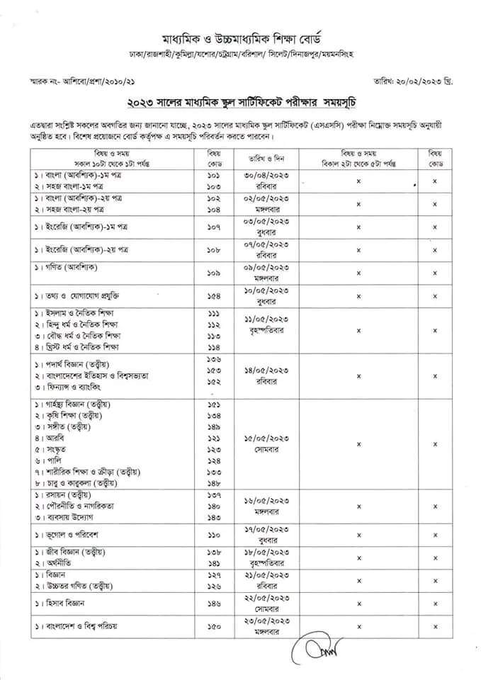 আগামী ৩০ এপ্রিল থেকে এসএসসি পরীক্ষা শুরু হবে বাংলাদেশ শিক্ষা বোর্ডের এক প্রজ্ঞাপন জারির মাধ্যমে পরীক্ষার রুটিন সহ প্রকাশ করেছেন।