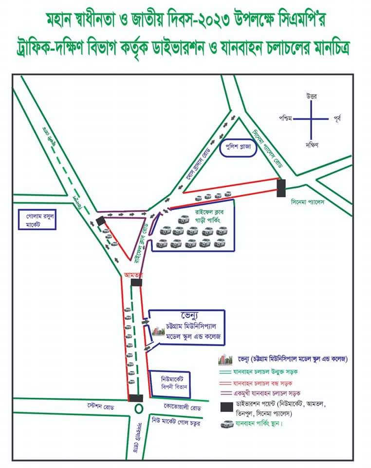 উক্ত অনুষ্ঠান সুন্দর ও সুশৃঙ্খলভাবে উদযাপনের লক্ষ্যে সিএমপি’র ট্রাফিক-দক্ষিণ বিভাগ কর্তৃক বিশেষ ট্রাফিক পুলিশী ব্যবস্থা গ্রহণ করা হয়েছে। উক্ত ট্রাফিক ব্যবস্থাপনায় প্রণীত নিন্মোক্ত নির্দেশনাসমূহ অনুসরণের জন্য বিশেষ ভোর ৫.০০ ঘটিকা হতে নগরীর তিনপুল হতে আমতল, আমতল হতে নিউ মার্কেট এবং নিউ মার্কেট হতে আমতল রোডে সকল প্রকার যানবাহন চলাচল বন্ধ থাকবে। তিনপুল মোড় হতে শিক্ষা অফিস ( রাইফেল ক্লাব) হয়ে আমতল পর্যন্ত একমুখী চলাচল বজায় থাকবে।