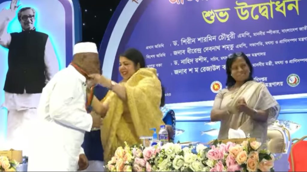 আজ মঙ্গলবার ২৫ জুলাই ঢাকায় ওসমানি স্মৃতি মিলনায়তনে অনুষ্ঠিত জাতীয় মৎস্য সপ্তাহের উদ্বোধনী অনুষ্ঠানে প্রধান অতিথি হিসেবে জাতীয় সংসদের স্পিকার ড. শিরীন শারমিন চৌধুরী এমপির হাত থেকে আনুষ্ঠানিকভাবে এ পদক গ্রহণ করেন তিনি।