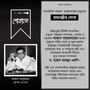সাংবাদিক আজাদ তালুকদারের মৃত্যুতে শোক প্রকাশ করেছেন তথ্য ও সম্প্রচার মন্ত্রী হাসান মাহমুদ এমপি।